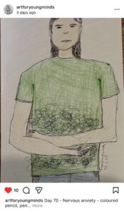 Every day since Tuesday 16 September Ayden has produced a piece of art and posted it on their instagram page @artforyoungminds to raise awareness of some of struggles that young people may go through. The themes of her artwork range from exam stress and mental health issues, to relationships, bullying and intrusive thoughts.