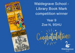 Well done to Zoe N, 9SHU, for her winning entry into Mrs Croucher’s Library competition for the best book mark designs. Zoe’s Charlie and the Chocolate Factory design is really fun. She will receive a £10 voucher.