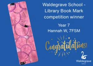 Well done to Hannah W, 7FSM, for her winning entry into Mrs Croucher’s Library competition for the best book mark designs. Hannah’s pink design is really striking. She will receive a £10 voucher.